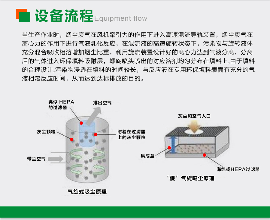 含塵含味氣體通過吸氣罩收集,在風機的作用下,經(jīng)過管道輸送負壓進入雙級氣旋噴淋塔。氣旋混流裝置快速運轉(zhuǎn),多級連續(xù)的凈化使得含塵含味氣體與水霧充份混合,在離心的作用下達到氣液分離。氣旋桶內(nèi)部采用水泵循環(huán)給水,水在水箱經(jīng)水泵增壓后自螺旋噴嘴霧化而出,最后回流至水箱循環(huán)使用。分離出來的雜物下沉到水箱底部,經(jīng)凈化后的氣體進入填料隔水層,然后由風機排出。