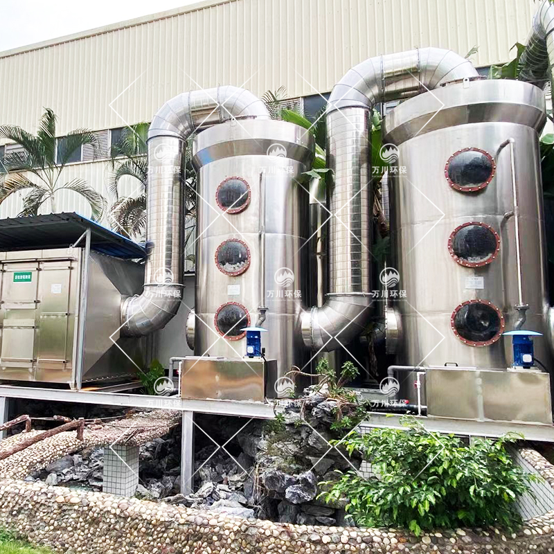 根據(jù)客戶需求和我司實(shí)地考察之后,最終采用‘兩級噴淋吸收法+活性炭吸附法’對其進(jìn)行處理。采用水噴淋一方面可以降溫,另一位方面能夠讓水吸一部分的有機(jī)廢氣,降低后續(xù)活性炭吸附的負(fù)荷。