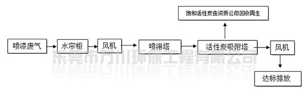 根據(jù)廠方提供的資料及現(xiàn)場勘察的情況。其噴漆廢氣的來源主要為無塵噴漆車間內(nèi)的5條自動噴涂線。在生產(chǎn)過程中有噴漆,該工序產(chǎn)生了一定量含三苯有機(jī)廢氣和噴漆粉塵,該廢氣不僅對環(huán)境造成污染,而且對人體有較大的危害作用,同時也破壞了周邊的環(huán)境,造成了不良的影響,需進(jìn)行處理后排放。我們工程師分析了該廢氣的特點(diǎn)和以往的案例經(jīng)驗,采用了“水簾柜+噴淋塔+活性炭吸附塔”這套解決方案。