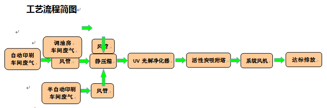 因為該企業(yè)印刷機車間均為密閉車間,且已做排風系統(tǒng),但排風系統(tǒng)和小風機均為直排到高空和廠房1樓外部,影響到了周圍環(huán)境。經(jīng)過我司工程師現(xiàn)場勘查,結合企業(yè)的實際生產(chǎn)情況,我們最終決定采用UV光解法+活性炭吸附法來進行處理。