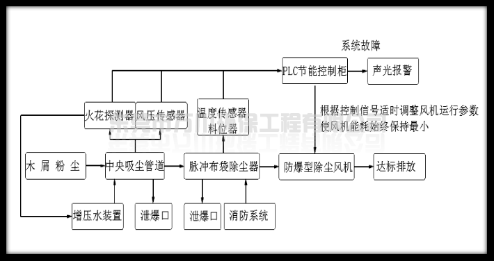 2)風(fēng)機在除塵器末端,避免木料中的金屬物通過管道直接吸入風(fēng)機中,將與風(fēng)葉摩擦的火花吹進(jìn)布袋除塵器中,導(dǎo)致安全隱患。